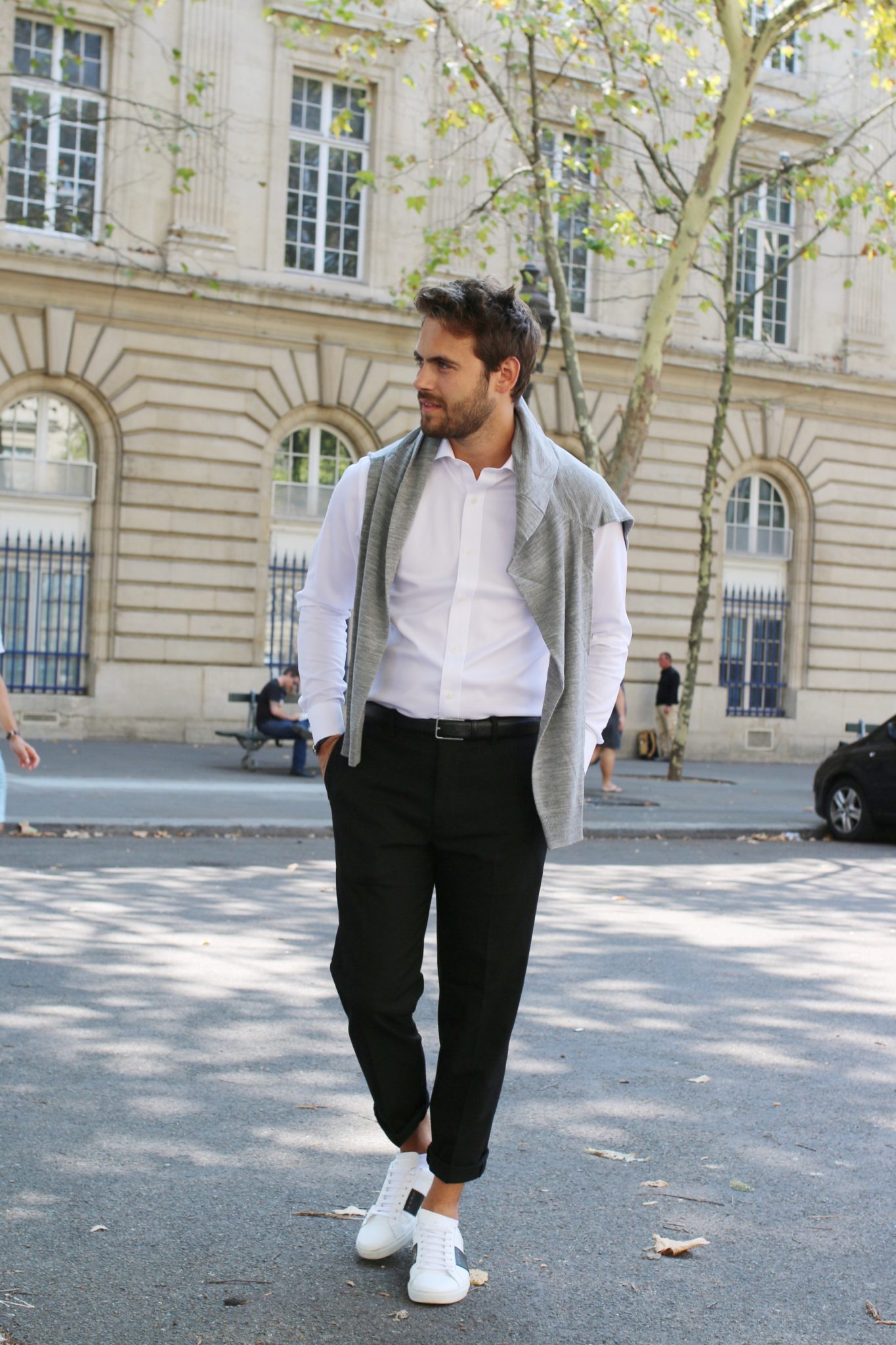 De beaux basiques. J’aime beaucoup le look avec juste la chemise et le pull gris sur les épaules, c’est super chic.