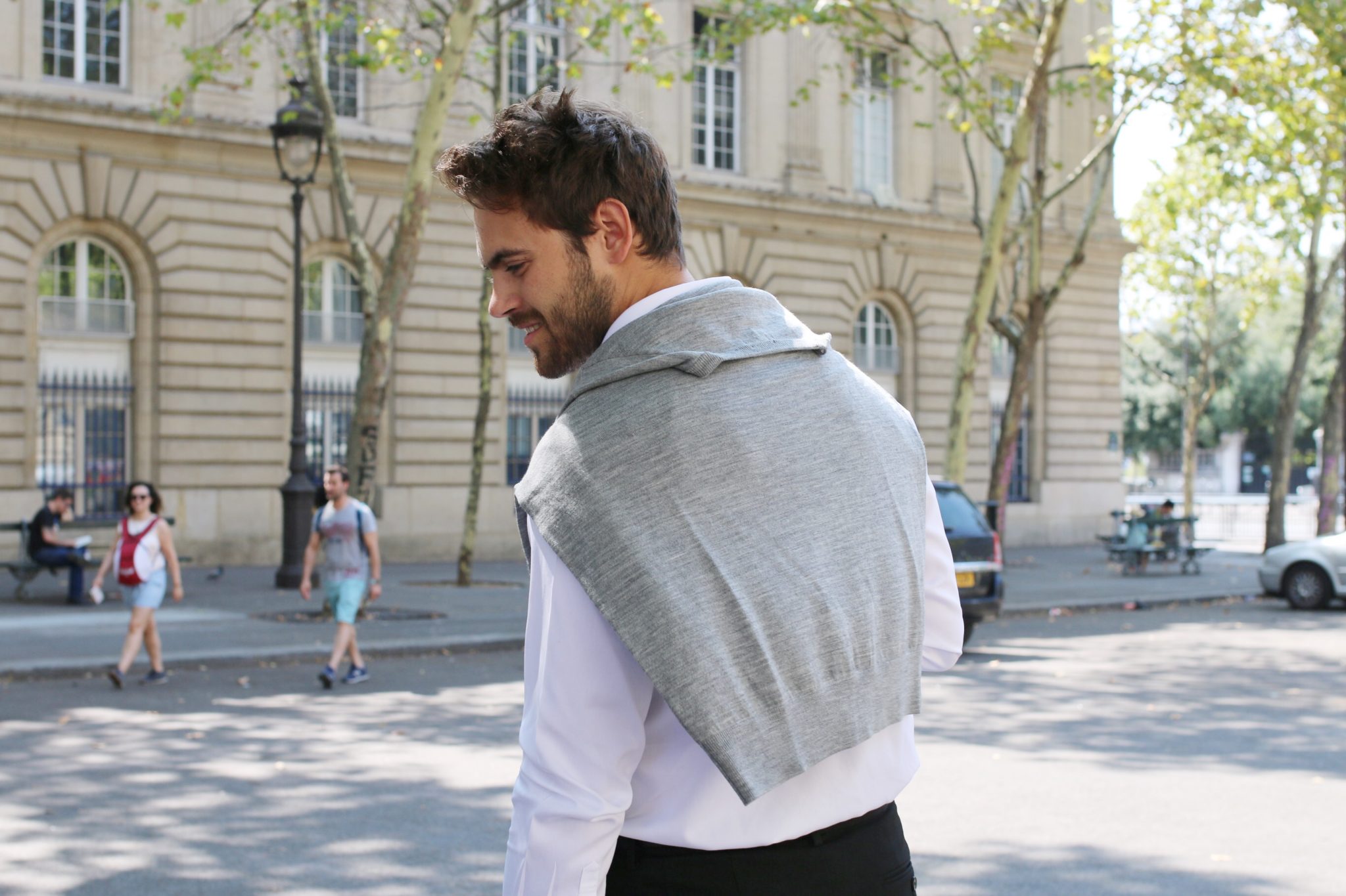 Dans ce look de rentrée, j’ai choisi le gris chiné qui va parfaitement et en toute occasion avec une chemise blanche. Sur les épaules quand le soleil se montre, à la place de la chemise pour les journées plus « casual » ou au-dessus si votre besoin est plus strict. Tout le monde peut donc se l’approprier et l’adapter à son style.